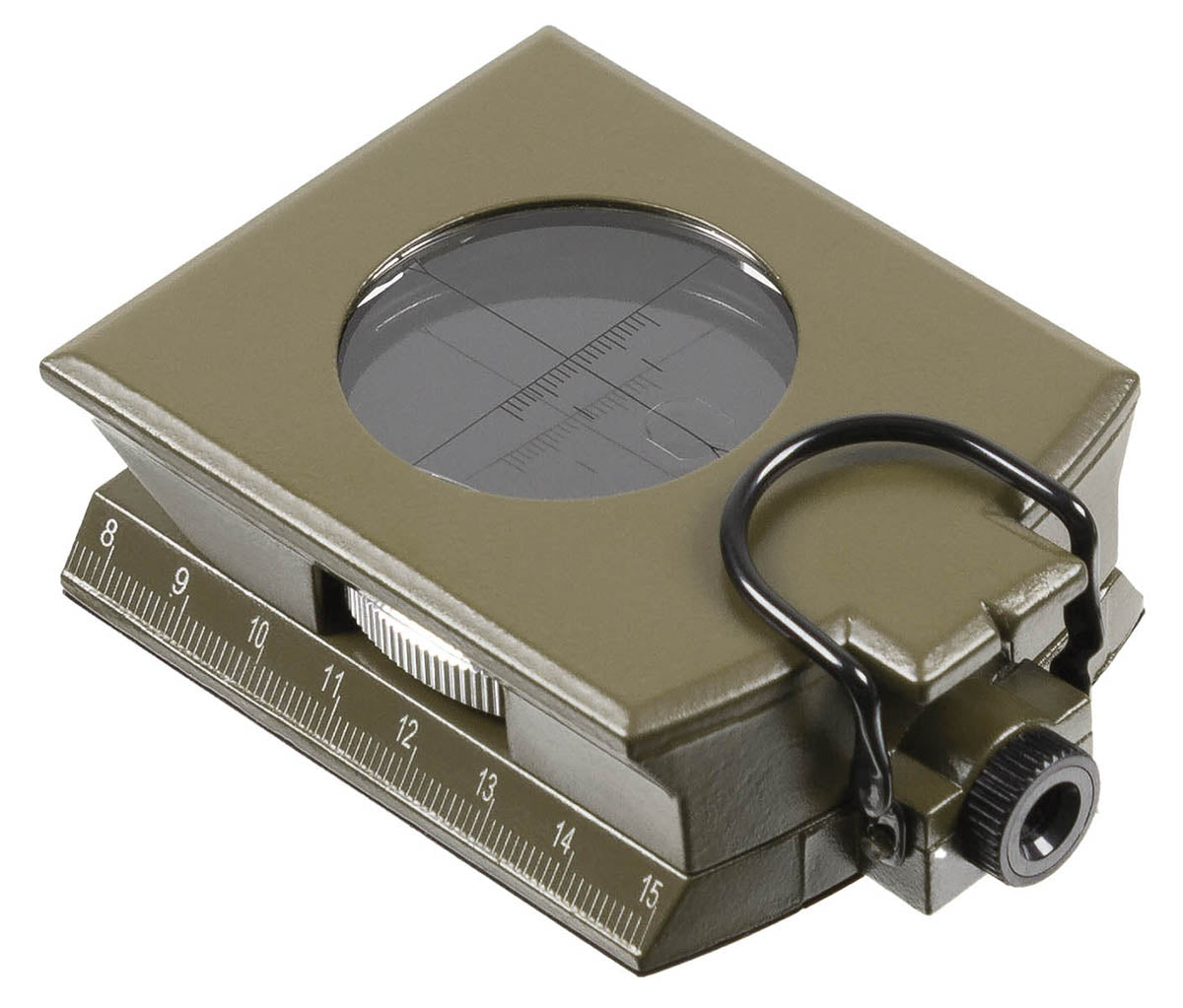 Über Kimme & Lupe ein Ziel anvisieren, Peillinie ausrichten, Azimut auf der 360°-Skala ablesen und auf die Karte übertragen.