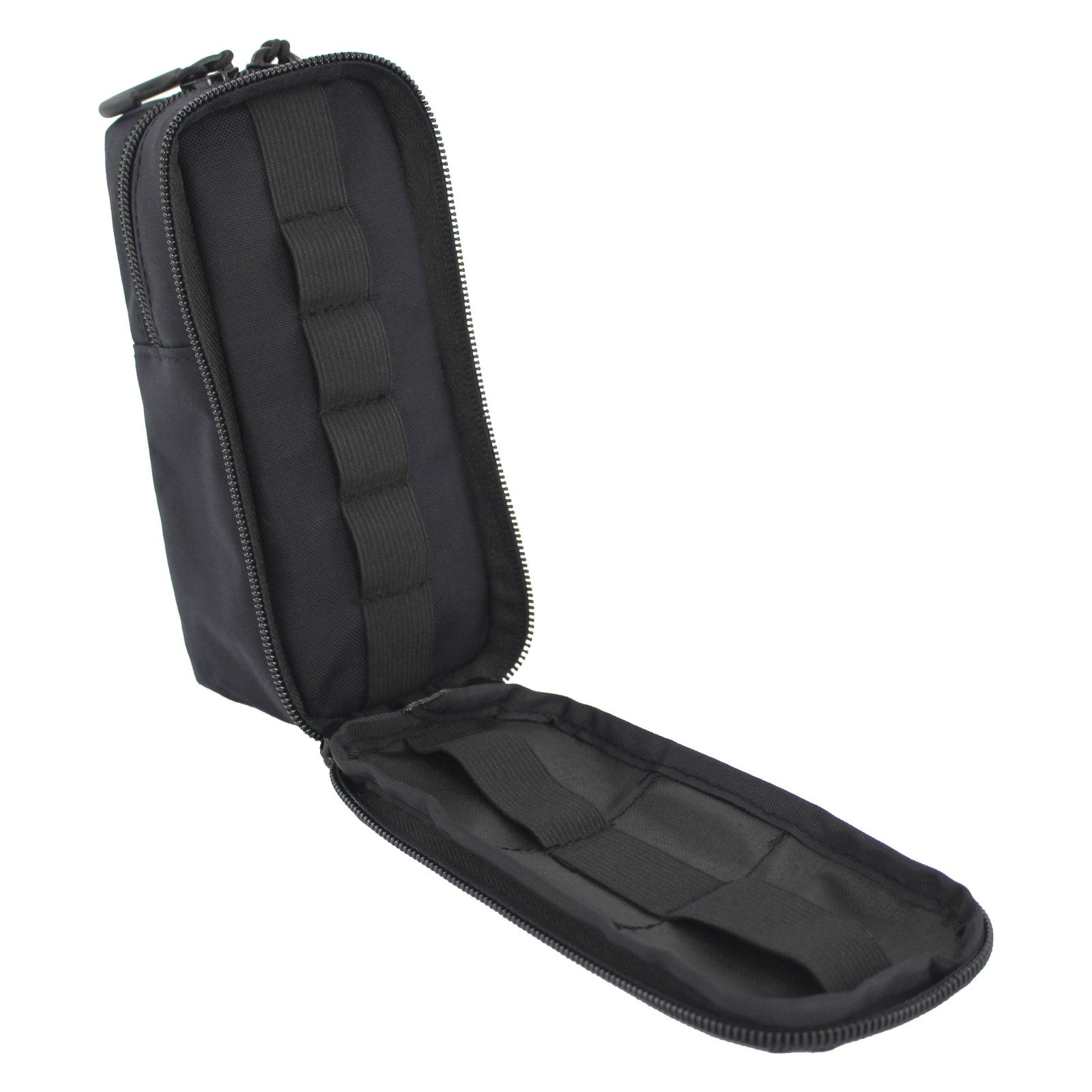 Das vordere Fach lässt sich komplett öffnen und ist mit elastischen Gummischlaufen auf beiden Innenseiten ausgestattet. Hier finden kleinere und mittelgroße Utensilien wie Akkus, Batterien, Kabel, Speicherkarten oder ähnliches Zubehör ihren sicheren Platz. Das hintere größere Fach ist mit einem Reißverschluss versehen, der sich zu einem Drittel öffnen lässt. Es eignet sich ideal für technische Geräte wie Taschenlampen, Funkgeräte, Kopflampen, Laternen oder GPS-Geräte.